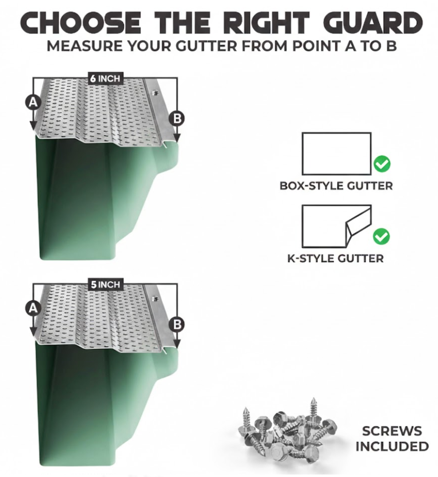 Installation is straightforward: place the panel on top of the gutter, align the front edge to the gutter lip, then fasten along the front edge. Sections install end-to-end and feature overlapping tabs for seamless connection. Corner sections can be trimmed as needed. Designed to fit common 6" gutter profiles, including K-style and box gutters. Fastening is simple: 3–4 screws along the front edge. Optional back-edge screws can be added to provide additional strength in snow and ice conditions. This product is not compatible with half round gutters.